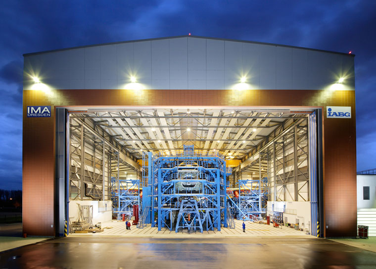 94 cilindri di prova Hydropuls di Hänchen muovono l'aereo nel banco di prova materiali. Sono il componente meccanico principale di un test accelerato. Per mezzo del test accelerato, in 18 mesi vengono simulate le sequenze di movimento dell'intera vita di un aereo di 25-30 anni. Questo Airbus effettuerà almeno 35.000 voli nel banco di prova – senza mai lasciare l'edificio direttamente accanto all'aeroporto di Dresda.