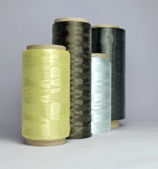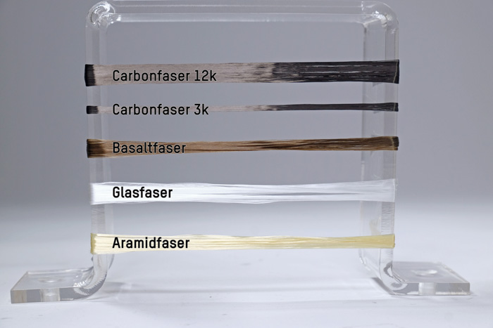 Immagine 2: Diversi materiali che si trovano, tra l'altro, in un avvolgitore. Spesso anche in combinazione, cosa che deve essere considerata durante lo svolgimento. (da sinistra a destra: aramide, basalto, fibra di vetro, carbonio)