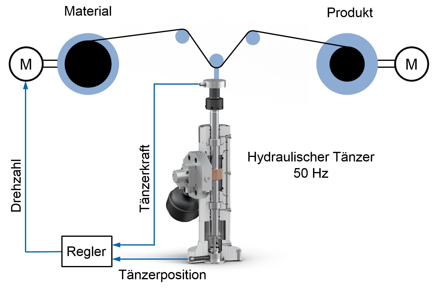 Durante l'accelerazione, il prodotto necessita di materiale applicato con una tensione del filo definita. Questa tensione del filo viene monitorata a forza controllata dai sensori del cilindro. Il cilindro idraulico si sposta verso l'alto o verso il basso con monitoraggio della posizione per applicare la forza definita e rilasciare il filo pretensionato. Il rullo di materiale regolato a una velocità costante deve reagire di conseguenza.