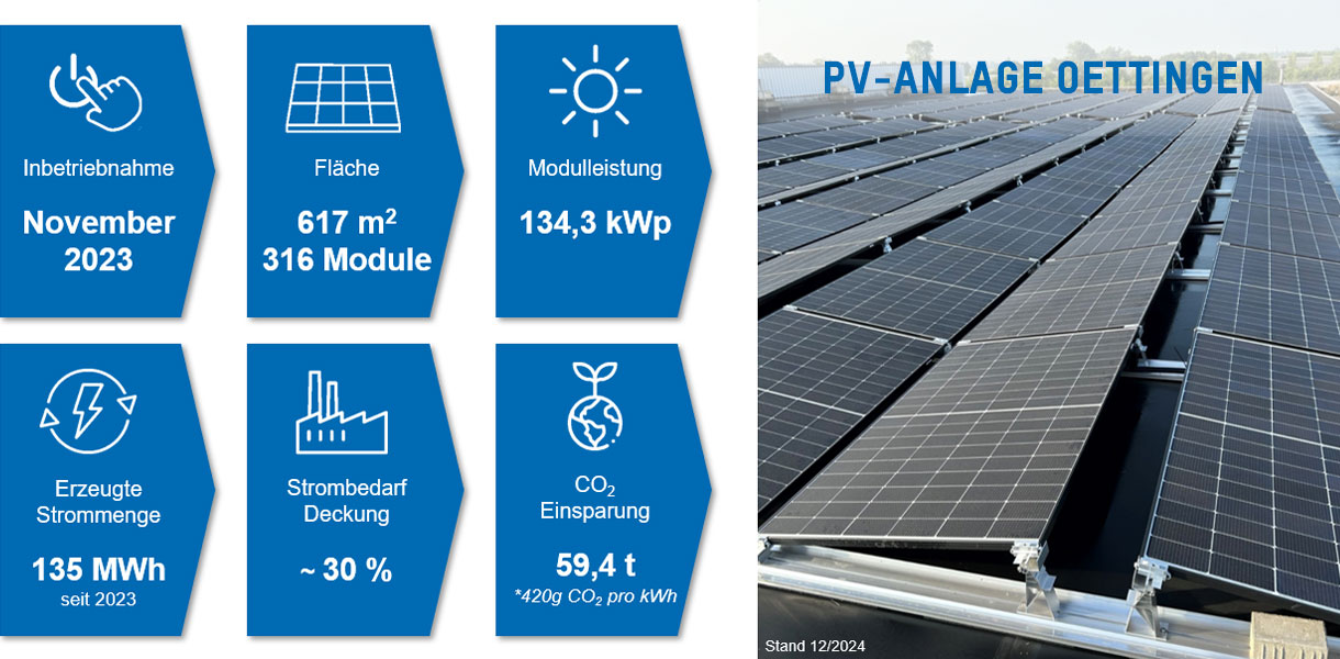 L'impianto fotovoltaico copre parte del fabbisogno di elettricità a Oettingen. In combinazione con l'elettricità acquistata da energia idroelettrica al 100%, il fabbisogno di elettricità del sito è completamente coperto in modo CO2-neutrale.