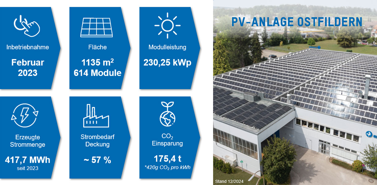 L'impianto fotovoltaico copre parte del fabbisogno di elettricità a Ostfildern. In combinazione con l'elettricità acquistata da energia idroelettrica al 100%, il fabbisogno di elettricità del sito è completamente coperto in modo CO2-neutrale.