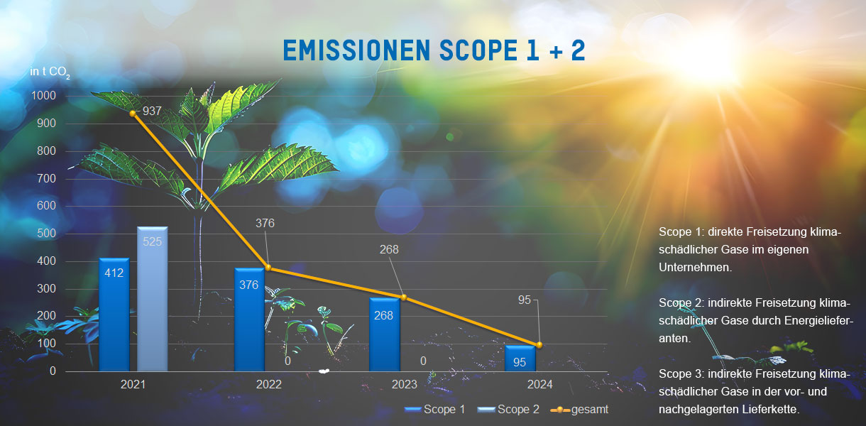 Grazie alle nostre diverse misure, siamo stati in grado di ridurre il nostro valore Scope 1 e Scope 2 da 937 t di CO2 nel 2021 a 95 t di CO2 nel 2024. Questa notevole riduzione dimostra il nostro impegno per la sostenibilità e la protezione dell'ambiente.