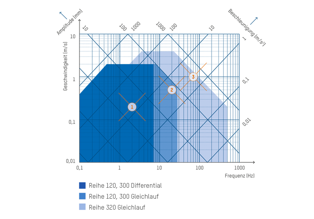 Qual è il tipo di cilindro giusto per le vostre esigenze? Il diagramma delle prestazioni serve come orientamento e descrive il movimento dinamico di un azionamento idraulico con un'oscillazione sinusoidale. Le classi di potenza dei diversi tipi di cilindro definiscono le possibili applicazioni.